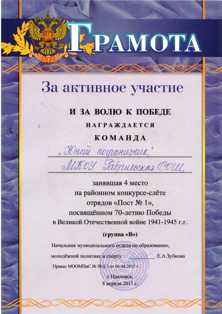 8 апреля прошёл районный конкурс-слёт отрядов "Пост №1", посвящённый 70-летию Победы в Великой Отечественной войне 1941-1945 гг. Команда школы "Юный пограничник" заняла 4 место среди средних сельских школ.